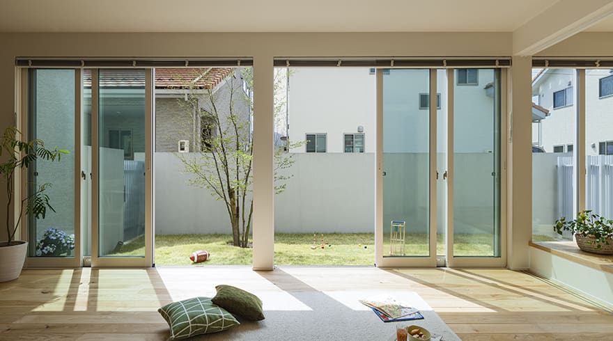 「凹凸のない、シンプルで美しい家」というご希望を実現した、陸屋根で長方形に近いフォルムの外観を持つM様邸。室内もシンプルというテーマでプランニングされ、冷蔵庫やIHヒーターまでも壁面収納におさめたLDKで視界に入るのはキッチンのシンクとダイニングテーブルとチェアのみ。庭から差し込む光が白い壁に反射して、シンプルさと広さがさらに際立つ効果も。そんなすっきりと気持ちよい空間は、効率よく光と風を取り入れたから。南、東、西の3面に開口を計画したため部屋全体に陽の明るさがいき渡り、心地よい風が家の中を吹き抜けます。「空間が広いので、子どもは毎日走りまわっています。キッチンから庭まで見通せるので、遊んでいる姿も見えて安心感があります」と奥様。納得の空間が出来ました。