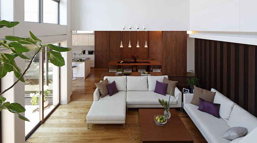 コートに面した吹き抜けリビング。吹き抜けを介して家族の気配が互いに届く