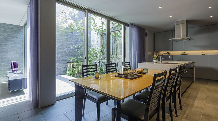 外からの視線や音を遮りながら、光や緑を取り込む中庭は、小さな森のような潤いをもたらす。