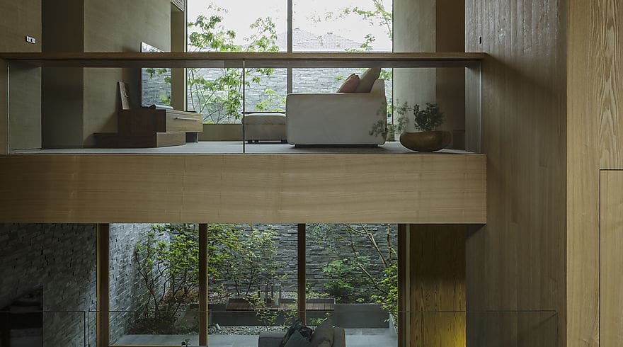 吹き抜けに面し、逆側は中庭の庭の木々の梢が手に触れそうな近さで見える、2階リビング。