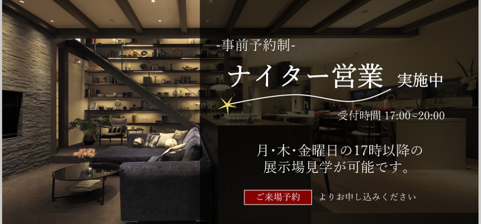事前のご予約で、月・木・金曜日の17時以降の展示場見学が可能です。(最終受付:20時)