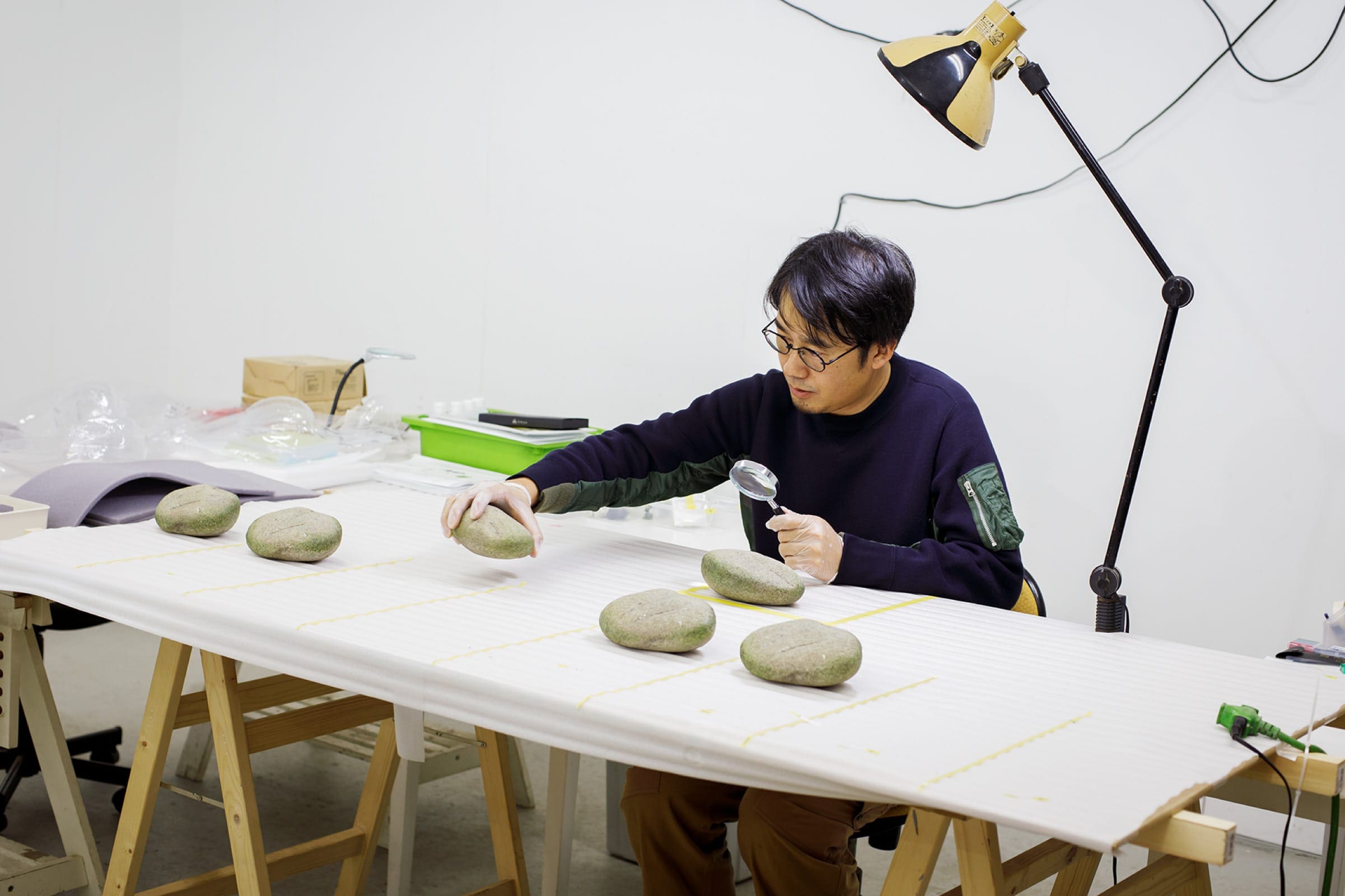 制作の始まりは、川へ行き、無数に転がる石の中から、思い描く形の完璧な“普通の石”を探すこと。それをオリジナルとして、別の石を砂を硬化させて形を作り、体積、苔、傷、模様など細部にいたるまですべてを模倣し(彼らはその工程をレタッチと呼ぶ)、まったく同じ“石”をこの世に存在させる。また、その中でオリジナルと、制作した石をシャッフルし、ひとつを川に投げる。彼らでさえも、いま手元にあるのが、オリジナルか、制作した石なのか分からないのだ。