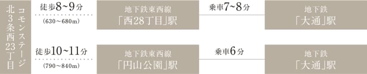 地下鉄西28丁目駅まで徒歩8~9分(630m~680m)