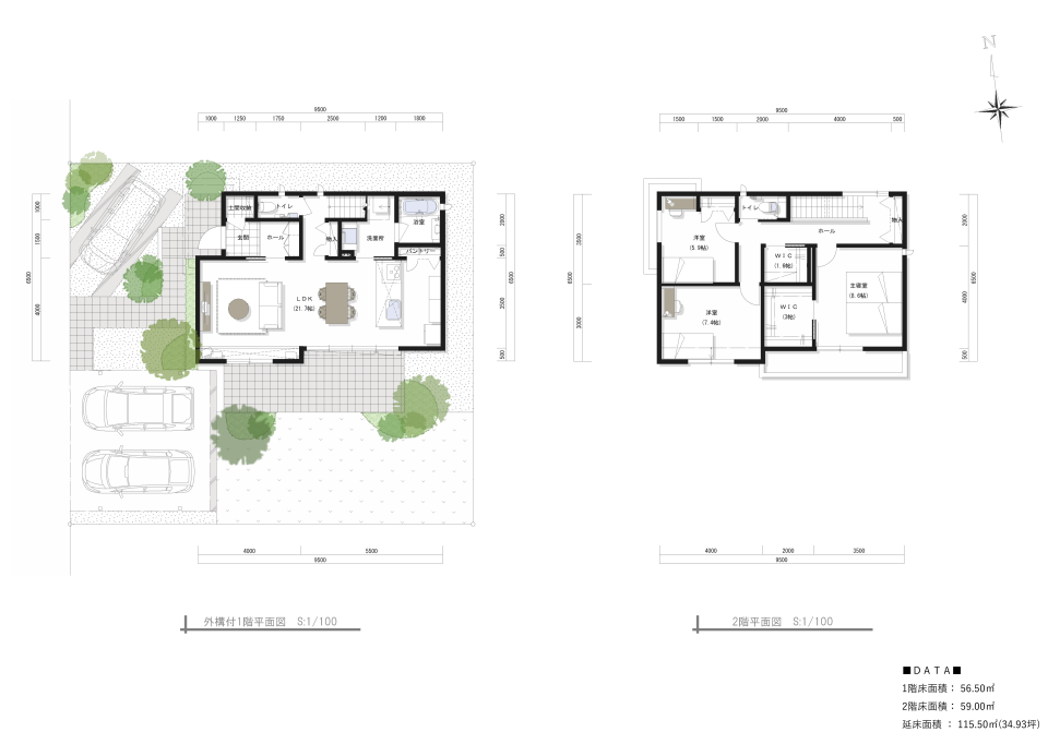 1階面積/56.50㎡(17.09坪) 2階面積/59.00㎡(17.84坪) 延床面積/115.50㎡(34.93坪)
