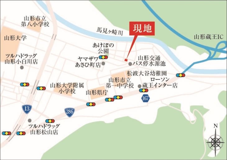 山形蔵王インターチェンジまで車で約3分(約1,100m~1,120m)、アクセス良好な分譲地です。
