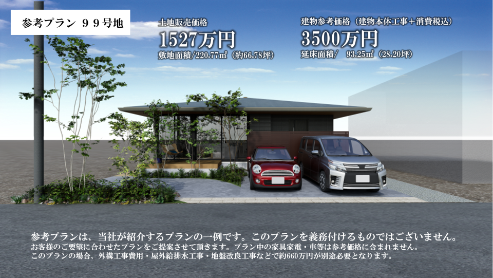 【参考プラン例】99号地 土地面積/220.77㎡(約66.78坪)土地価格/1527万円