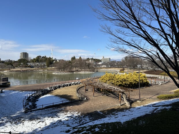 池の周りには桜の木・花壇・遊び場があり、四季折々の花が美しい公園です。