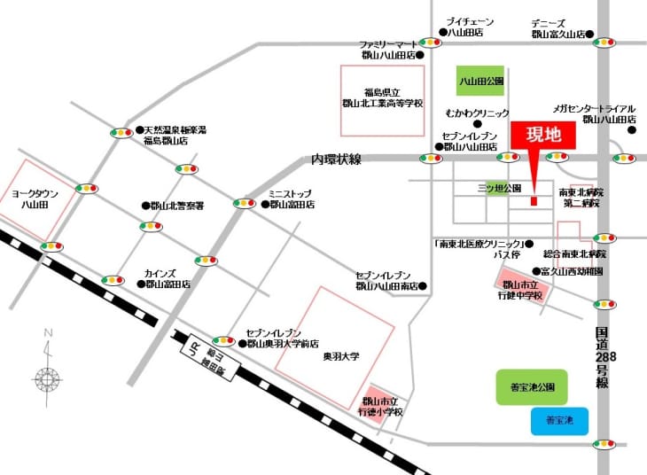 郡山市立行徳小学校まで徒歩18分、郡山市立行健中学校まで徒歩6分。内環状線まで約260m、国道288号線下り線まで約600m(車で2分)・上り線まで約750m(車で3分)、幹線道路にアクセスが良く利便性の高い立地です。