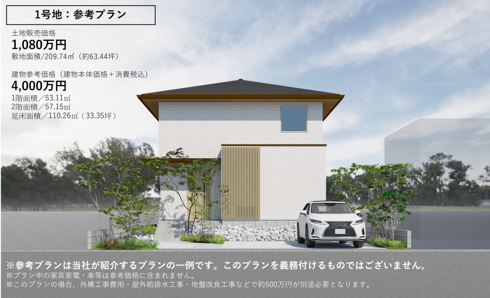 【参考プラン例】1号地/土地面積 209.74㎡(約63.44坪)土地価格 1,080万円