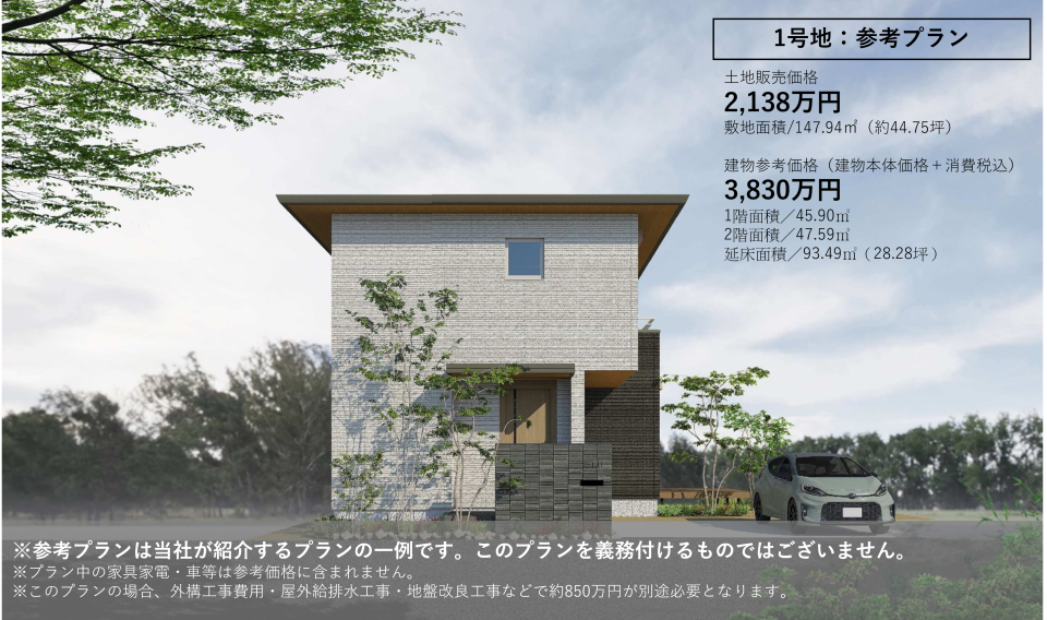 【参考プラン例】1号地/土地面積 147.94㎡(約44.75坪)土地価格 2,138万円