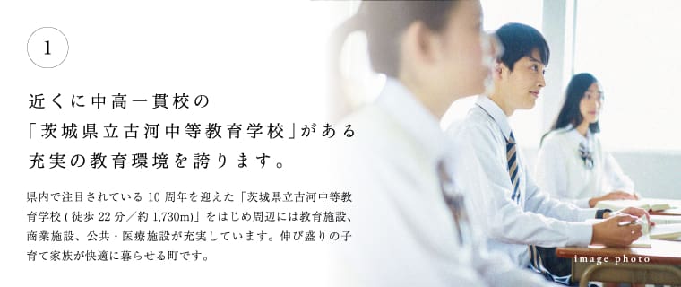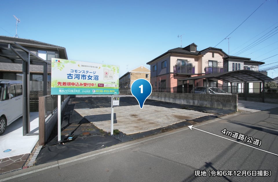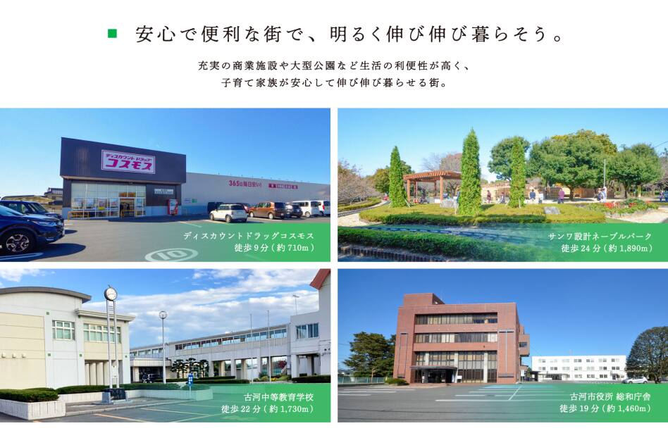 古河市役所(徒歩19分/約1,460m)や商業施設など生活の利便性に加え、中高一貫校の県立古河中等教育学校(徒歩22分/約1,730m)、中央運動公園(徒歩14分/約1,050m)も近く、子育て家族に魅力的な住環境に、ゆとりある広さの敷地をご用意致しました。