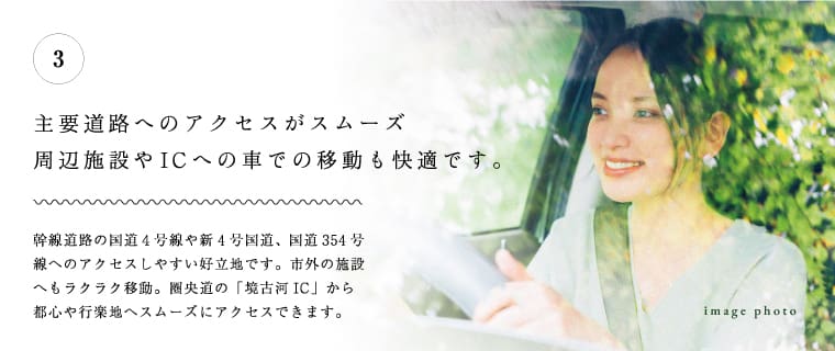 幹線道路の国道4号線や新4号国道、国道354号へのアクセスが良いので、車での移動がスムーズで快適です。