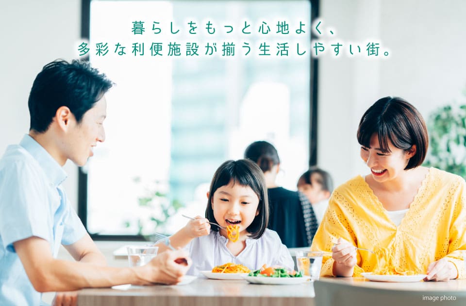 - 保育園・幼稚園・小学校・医療施設が近くにあり、子育て家族が暮らしやすい街です。利便施設が整った住環境。日々の生活に潤いとゆとりが生まれます。