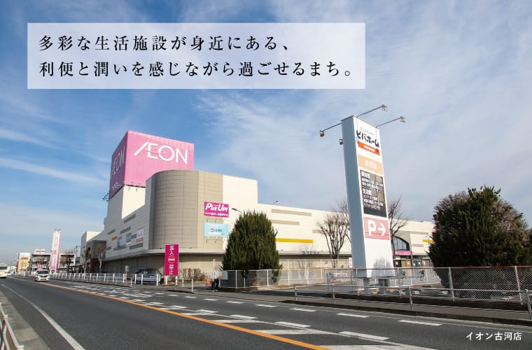 2つの大型商業施設や総合病院、利便施設が揃う注目の「古河駅東エリア」。歴史を紡いできた落ち着いた街での 暮らし、利便と潤いを感じながら過ごす日常。多彩な生活施設が身近にあるファミリーステージの街で新しい 生活を始めませんか。