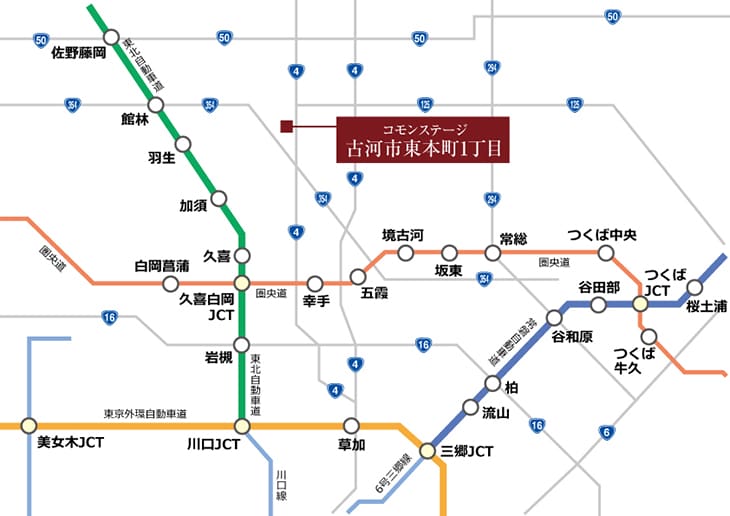 幹線道路の国道4号線や125号線・354号線へのアクセスが良く、東北道「館林IC(車で30分/約14,526m〜約14,530m)」や圏央道「境古河IC(車で31分/約15,316m〜約15,320m)」からのお出かけも便利。