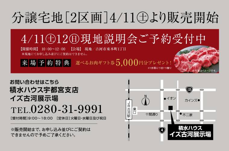 積水ハウス株式会社  宇都宮支店 イズ古河展示場定休日:火曜日、水曜日及び祝日 営業時間:9:00~18:00 ●当会場では、購入の申し込みは受け付けておりません。