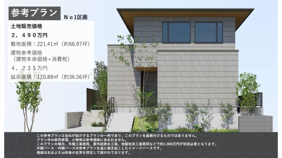 このプランの場合、外構工事費用、屋外給排水工事費用、地盤改良費用などで約1,000万円が別途必要です。
