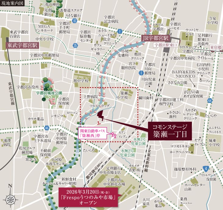 宇都宮の中心部に位置し、利便性が高いエリア。現地から徒歩10分の場所に、幅広いジャンルの飲食店が出店する「Frespoうつのみや市場」が2026年3月20日にオープンしました。ますます魅力的に利便性のある場所に。