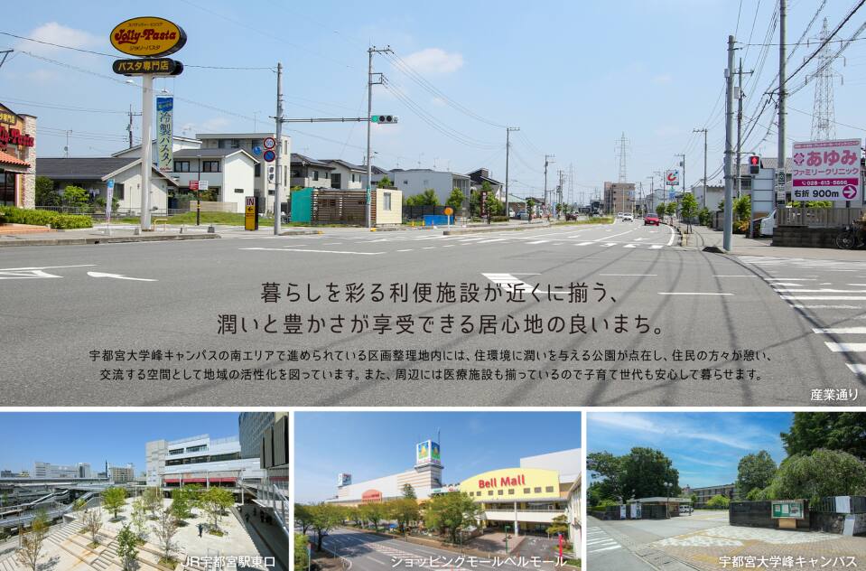 - JR「宇都宮」駅周辺も生活圏、再開発で開業した「宮みらいライトヒル(徒歩33分/約2,630m)」、「ライトキューブ宇都宮(徒歩34分/約2,660m)」を含む「宇都宮テラス(徒歩34分/約2,700m)」など多彩な施設が集まる賑わいのあるエリアです。宇都宮大学峰キャンパスまでも徒歩9分(約710m)の距離です。