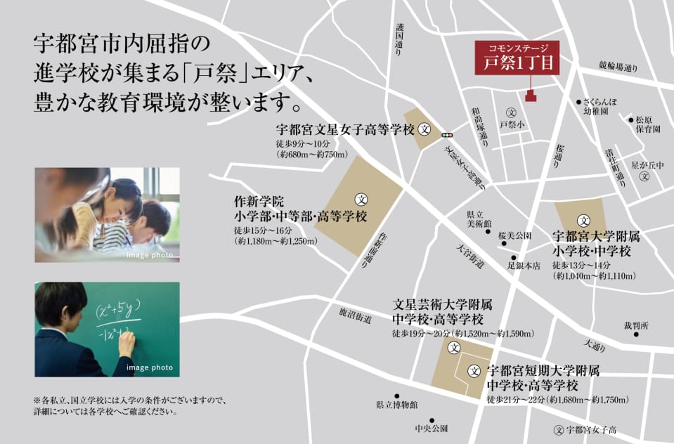 このエリアには徒歩12分圏内にある公立の「戸祭小学校」「星が丘中学校」はもちろん、私立の「作新学院小学部・中等部・高等学校」「文星芸術大学附属中学校・高等学校」「宇都宮短期大学附属中学校・高等学校」「宇都宮文星女子高等学校」、国立の「宇都宮大学附属小学校・中学校」など進学校が集まっているので通学に便利です。商業施設や文化施設・医療施設も揃い暮らしに潤いとゆとりが生まれるまち。将来性を期待されている旧県立体育館の跡地には県立美術館や図書館などの移転も検討されています。