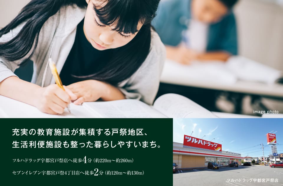 - 戸祭エリアは子育て世代をサポートする充実の教育施設や医療施設・生活利便施設が整った潤いゆたかで暮らしやすいまちです。