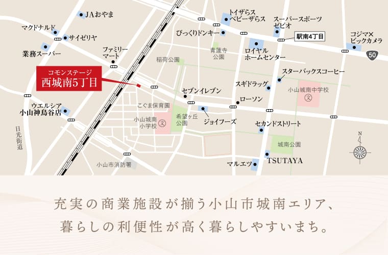 ![]() マルエツ小山店やウエルシア小山神鳥谷店、ファミリーマート小山神鳥谷店(徒歩5分/約350m)が揃い、多世代の快適な暮らしをサポート。教育・医療施設、商業施設が充実した暮らしやすい街です。暮らしを彩る利便施設が集積するまちで愉しく暮らしませんか。 |