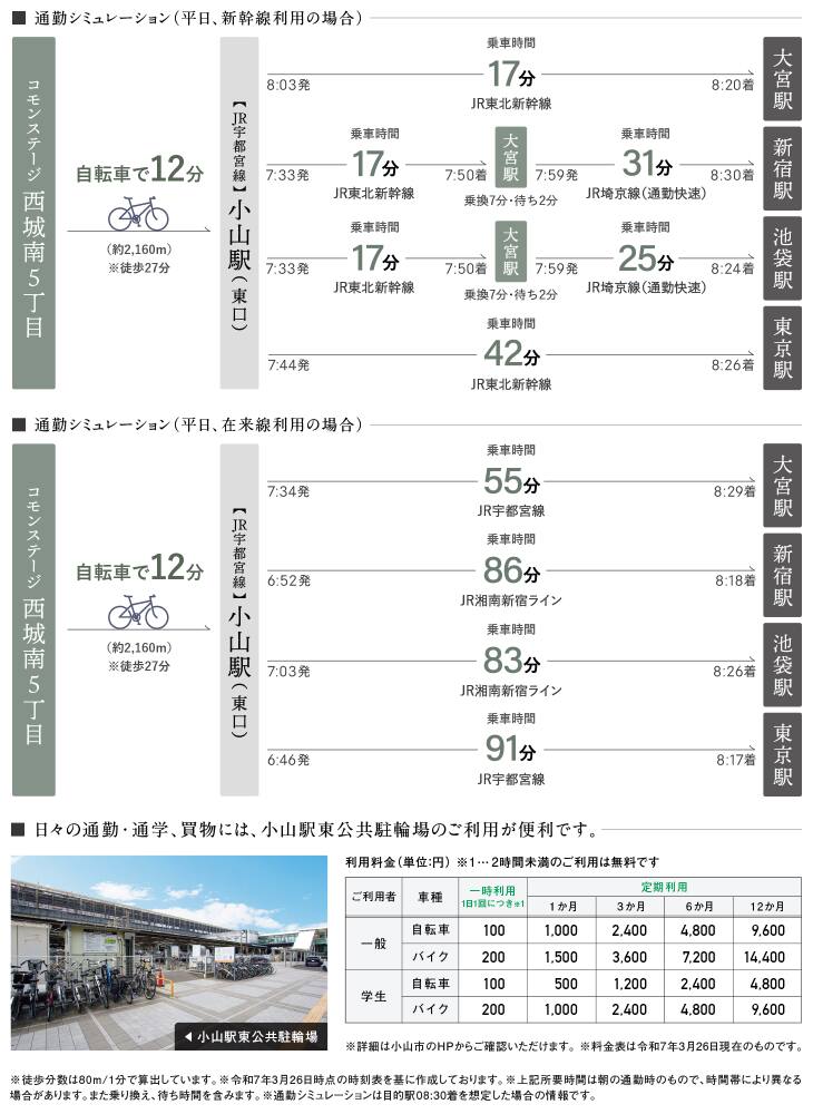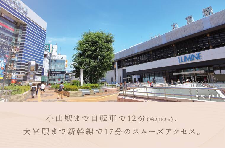 ![]() 自転車利用で県内有数のターミナル駅「JR小山駅」へ12分。駅からは新幹線・始発の在来線で首都圏へ快適にアクセス。日々の通勤通学・買物に利用できるので、生活圏が広がり豊かで潤いのある生活を享受できます。 |
