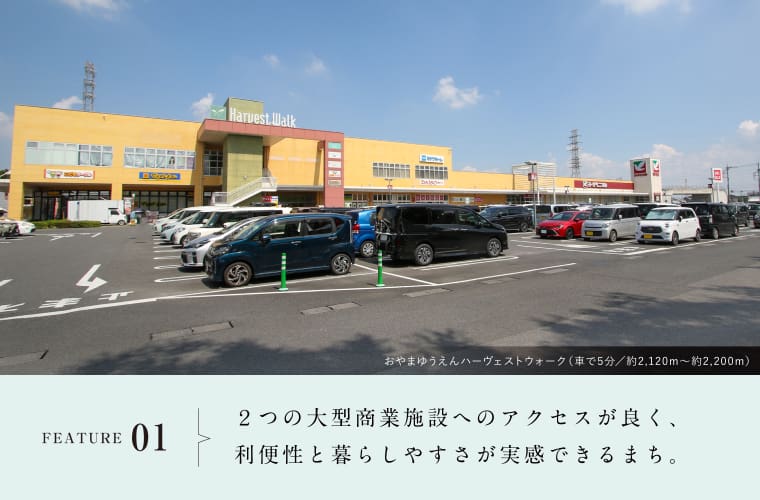![]() 「おやまゆうえんハーヴェストウォーク」「イオンモール小山」の2つのショッピングモールへスムーズにアクセスでき、日々のお買い物にも便利。小学校までの道のりには遊歩道・歩道橋が整備され、安心して通学できます。子育て世代からシニアまで、多世代の家族が穏やかに暮らせる優しいまちです。 |