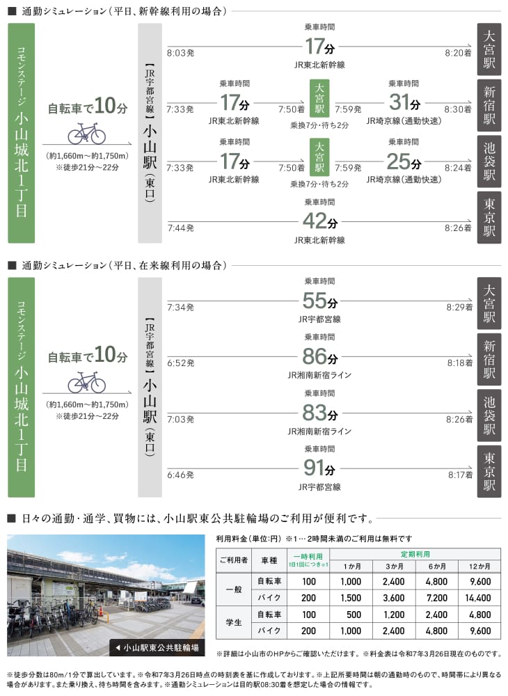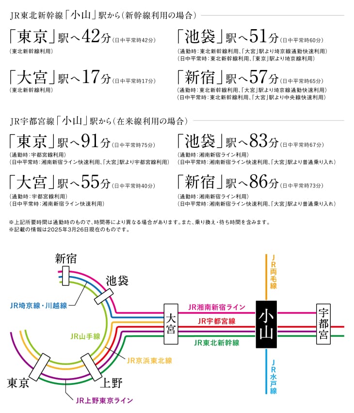JR「小山」駅からは、在来2路線と東北新幹線で都心や宇都宮方面へ快適に通勤・通学ができます。