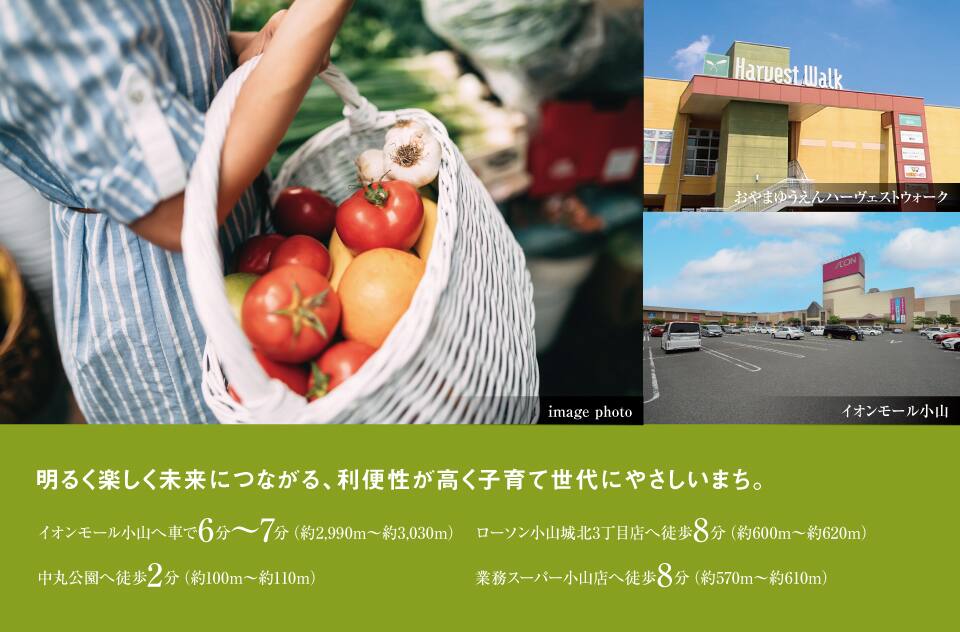 「おやまゆうえんハーヴェストウォーク」と「イオンモール小山」の2つのショッピングモールへのアクセスが良く、日常使いできるので楽しいお買い物ができます。