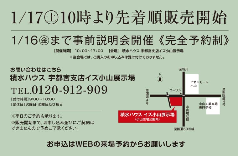 積水ハウス株式会社 宇都宮支店イズ小山展示場定休日:火曜日、水曜日及び祝日 営業時間:9:00~18:00 ●当会場では、購入の申し込みは受け付けておりません。