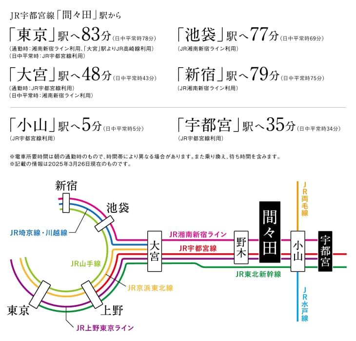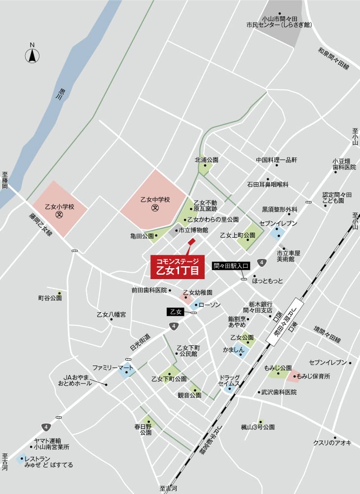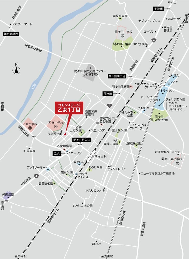 ![]() 3路線利用可能な「間々田」駅へ徒歩8分。日々の暮らしにゆとりが生まれる「駅近生活」。JR湘南新宿ライン、上野東京ライン、宇都宮線の3路線で「東京方面」と「新宿方面」へ直結し、通勤・通学も快適です。都心へ快適にアクセスできるまちで、穏やかで潤いのある暮らし始めませんか。 |