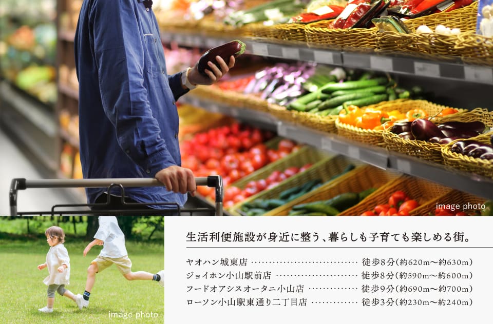 毎日のお買い物は徒歩10分圏内にある3つのスーパー「ヤオハン城東店」「ジョイホン小山駅前店」「フードオアシスオータニ小山店」が便利。多世代の暮らしを支える都市の利便性と寛ぎを感じながらゆとりに満ちた暮らしが広がります。