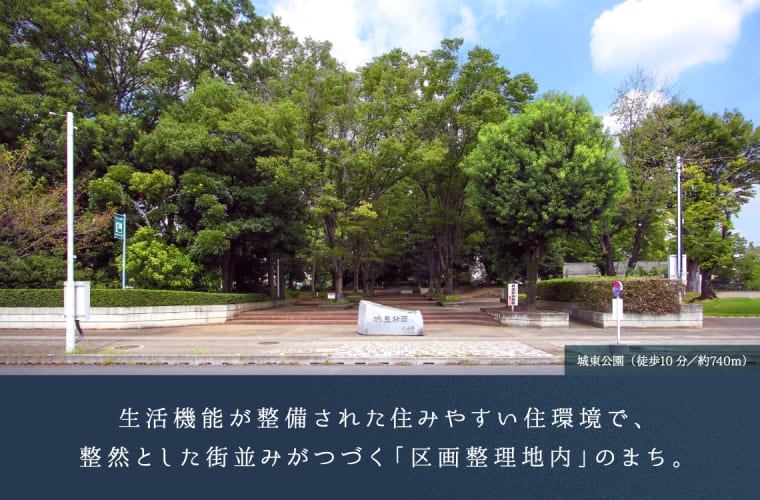 ![]() 駅東からつづく城東エリアは、区画整理地内の暮らしやすいまちです。道路や公園が整備され、子育て世代に優しく安心して暮らせます。都市の利便性と緑豊かな自然に恵まれた住みやすい環境。積水ハウスは、統一感のある美しい街づくりを進 めます。 |