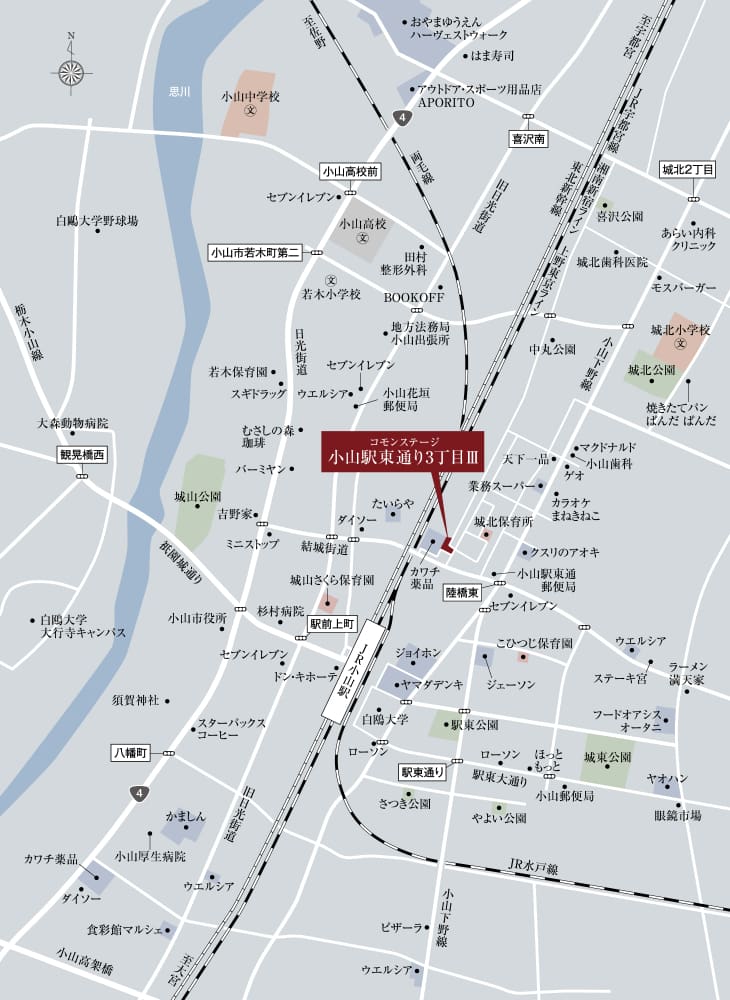 JR「小山」駅へ徒歩12分。(約900m~920m)