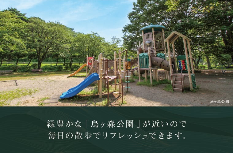 ![]() 桜やつつじ、紫陽花などの花の名所として知られ、日本庭園や池、遊具も備えた広場がある寛ぎと癒しの空間「烏ヶ森公園」が徒歩7分圏内にあり、みどり豊かな自然に恵まれた住環境を誇ります。 |