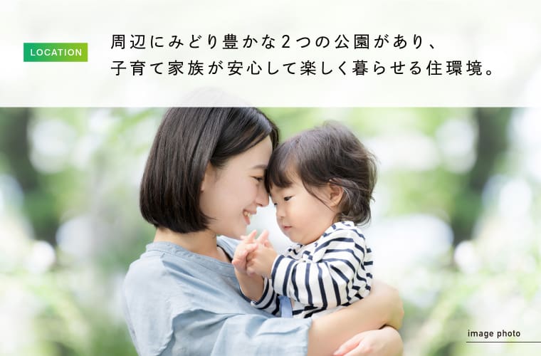 商業施設が徒歩圏にある利便性が高く暮らしやすい街。みどり豊かな自然に恵まれた環境が、子育て世代の健やかな成長を見守ります。