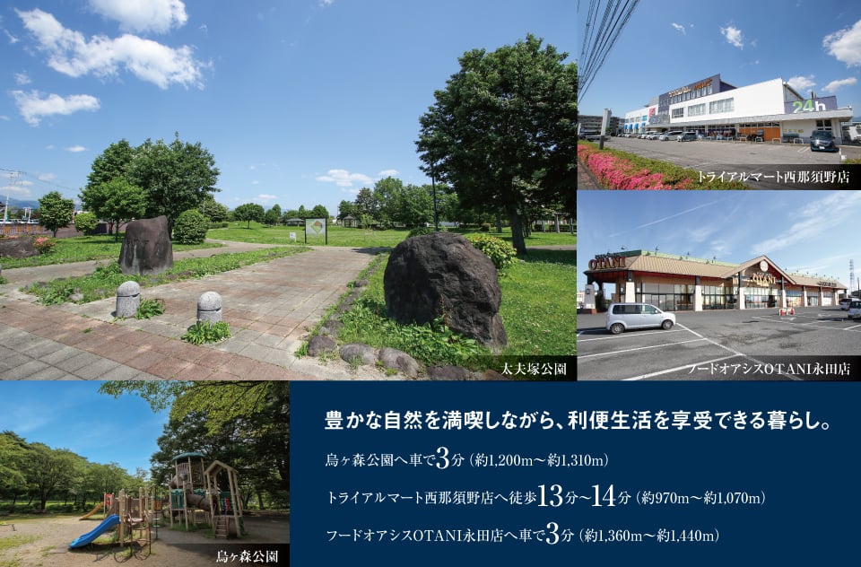 ショッピングモールの「アクロスプラザ西那須野」やスーパー・公園が近くにあり、利便性が高く毎日の暮らしにゆとりが生まれます。四季の移ろいを感じながら、家族がいつも笑顔でいられる街です。