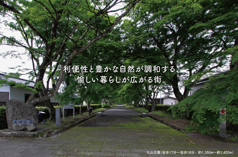 多彩なショッピング施設が集うロケーション。「西那須野」と「大田原」2つの「エリア」が生活圏なので愉しい暮らしがおくれます。週末は新緑も紅葉も美しい「大山公園」や大田原市の「美原公園(徒歩24分〜25分/約1,870m〜約1,940m)」で家族でのんびりリフレッシュ。