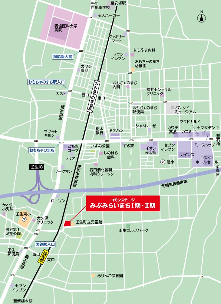 北関東自動車道「壬生IC」(車で4分/約1,770m〜約1,910m)が近く、都心やリゾート地へ快適なカーアクセスを楽しめます。