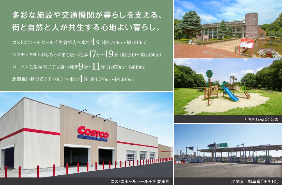周辺には「ありんこ保育園(徒歩11分〜徒歩12分/約810m〜約950m)」や複数のスーパーや大型量販店「コストコホールセール壬生倉庫店」、ドラッグストアやコンビニなど、生活利便施設が充実しているので快適な暮らしが送れます。また、高度な医療が受けられる「獨協医科大学病院」をはじめ、充実した医療施設が近くにあり多世代が安心して暮らせるまちです。