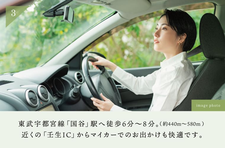 ![]() 駅近の利便を享受できるロケーション。「国谷」駅からは宇都宮市内や近隣の町への通勤や通学もスムーズです。近くを走る幹線道路から宇都宮市内やショッピングモールへも快適アクセス。「壬生IC」(車で4分/約1,770m〜約1,910m)から都心やリゾート地へ快適なカーアクセスができる恵まれたポジションです。 |