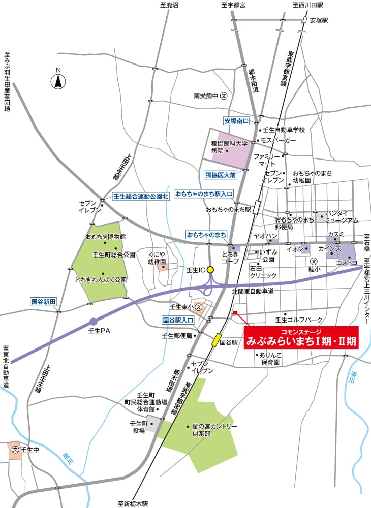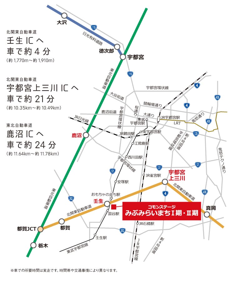 北関東自動車道「壬生IC」(車で4分/約1,770m〜約1,910m)が近く、都心やリゾート地へ快適なカーアクセスを楽しめます。