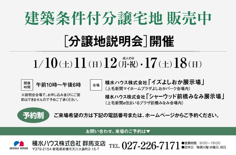 積水ハウス株式会社 群馬支店定休日:火曜日、水曜日及び祝日 営業時間:9:00~18:00