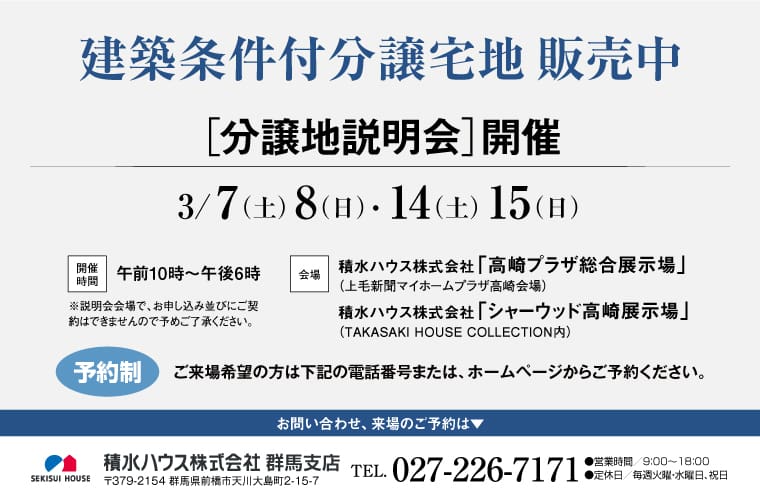 積水ハウス株式会社  群馬支店定休日:火曜日、水曜日及び祝日 営業時間:9:00~18:00