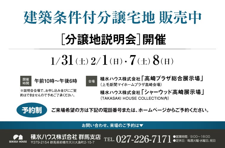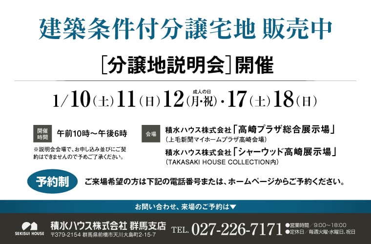 積水ハウス株式会社 群馬支店定休日:火曜日、水曜日及び祝日 営業時間:9:00~18:00