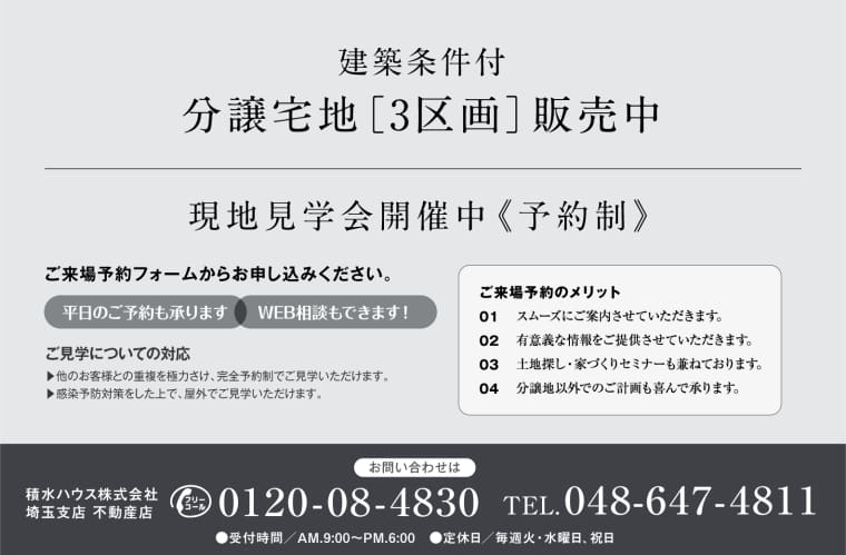 積水ハウス株式会社 埼玉支店定休日:火曜日、水曜日及び祝日 営業時間:9:00~18:00