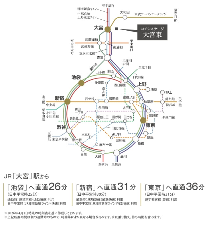 最寄りの「大宮」駅は、在来線10路線と新幹線6路線が発着するビッグターミナル。交通の要衝で都心や全国の各都市へスピードアクセスできます。
