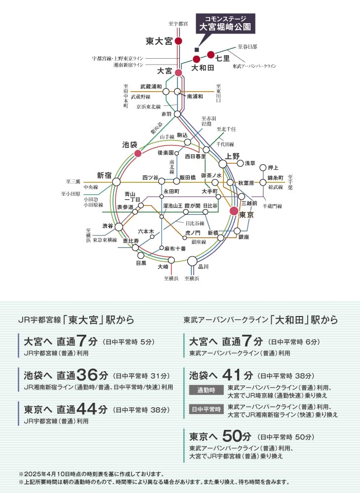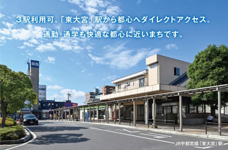 ![]() JR「東大宮」駅からは湘南新宿ラインと上野東京ラインの2路線で都心へダイレクトにアクセスします。東武「大和田」駅から3駅目の「大宮」駅乗り換えで都心の主要駅へスピードアクセス。「大宮」駅には6路線の新幹線が発着し、交通の要でリゾートエリアへ直結します。●JR宇都宮線「東大宮」駅(約1940m〜約2000m)●東武線「大和田」駅(約1120m〜約1190m)●東武線「七里」駅(約1480m〜約1550m) |