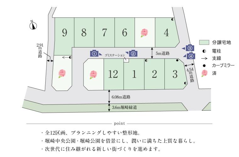 ![]() 分譲地南側に広がる緑豊かな「堀崎中央公園・堀崎公園」。四季折々の移ろいを感じながらの堀崎緑道での散歩も楽しみです。北側の自治会館には桜の木が借景に。全区画プランニングしやすい整形地をご用意。「まちなみガイドライン」で統一感のある上質な街づくりを進めます。 |